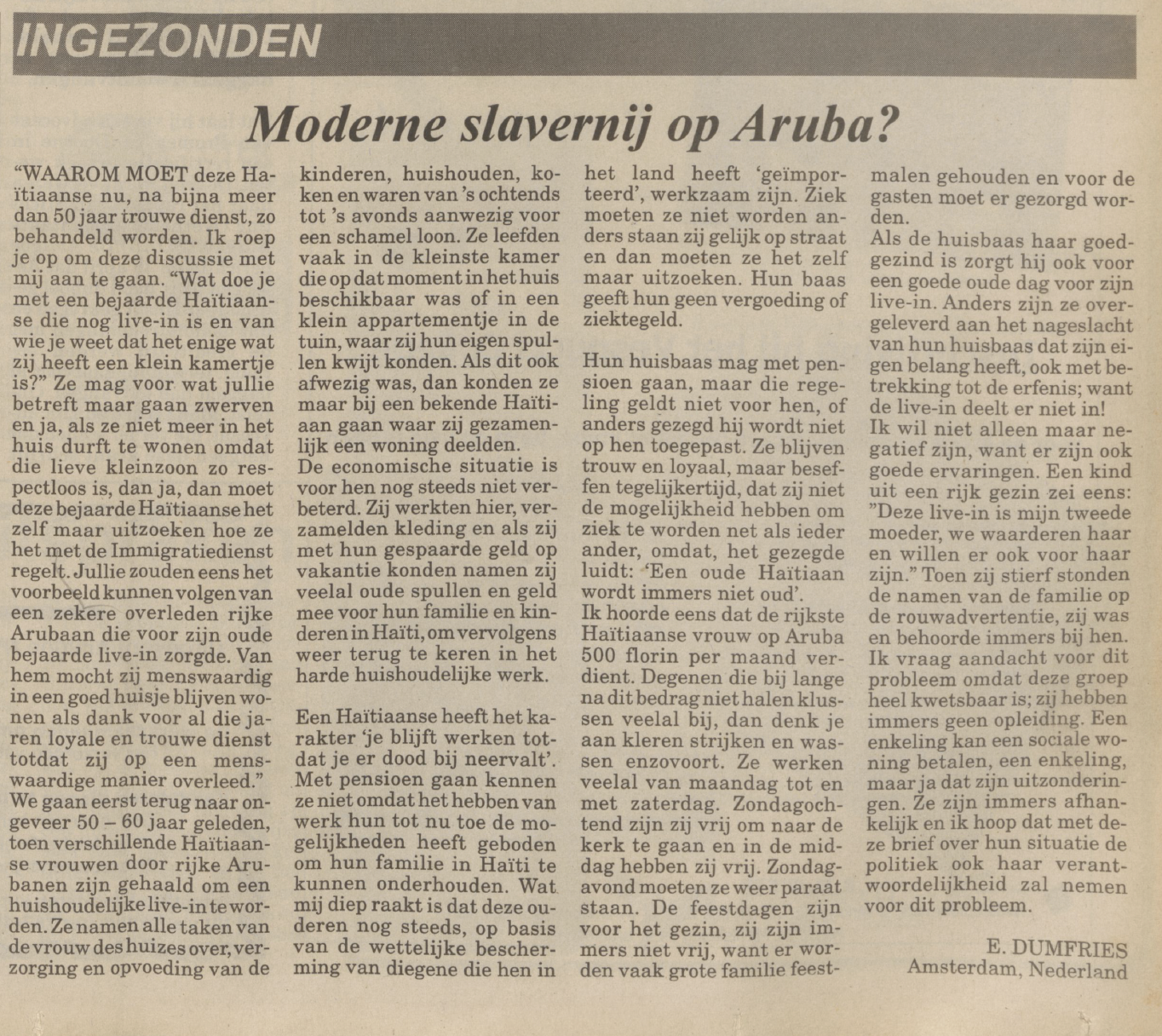 2005 E.Dumfries: Amigoe di Aruba. 12 mei 2005 Maatschappelijke positie Haïtiaanse Ouderen. Moderne slavernij op Aruba?. (lees meer)